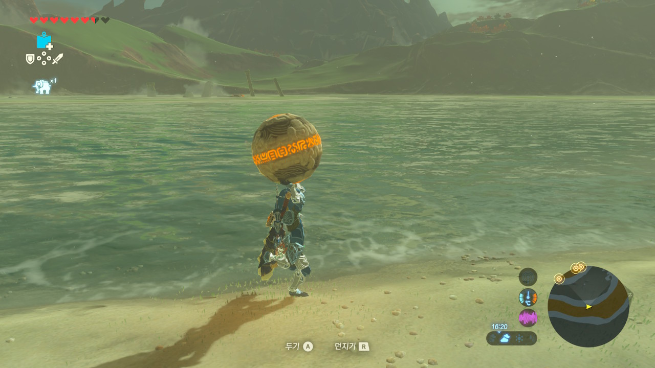 세바스챤을 타고 마구간 옆 동쪽 해안을 향해 출발합니다.소용돌이 모양 땅이 있네요. 이름이 스핀 반도! 해양학적으로 형성되는 것이 거의 불가능한...그렇지만, 여긴 하이랄 세계!스핀 반도를 향해 헤엄쳐 가 봅니다. 가운데에 고대 그리스 유적 같은 것이 보이네요.망원경으로 자세히 보니, 제단이 보입니다. 저기에 보주를 넣으면 숨겨진 사당이 나오겠네요. Got it!스핀반도를 돌아나가면 유적이 있는 언덕이 보입니다. 가는 길에 몬스터가 많은데, 즐겁게 해치워 주면 됩니다. ^^저 언덕으로 올라가면 무슨 단서가 있을 거야!오전에 날이 약간 흐려지니까 아침 안개처럼 뿌연 것이 뭔가 몽환적이네요. '내가 경치에 취할 때가 아닌데...'보주(고대의 구슬)이 있는 곳을 찾았습니다. 이제 저 가운데로 가져가야 하는데...열심히 달려갑니다. 그런데 스핀반도를 돌아서 가운데로 가기엔 너무 먼 길인데...ㅠㅠ